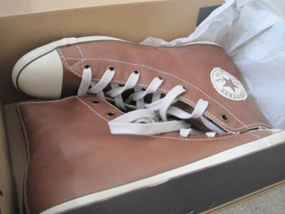 Löysin nimittäin nahkaiset Converset ja juuri siinä värissä kuin halusinkin! :) Tulin keväällä siihen tulokseen, että toiset Conssit on saatava, koska tuntui, ettei mulla ollut mitään muita kenkiä jalassa ikinä. Hävetti jo postata tänne blogiinkin kuvia…”ja jalassa Converset. Taas.” ;) Kankaisena nämä kaverit ovat valitettavasti jaloilleni liian lörpöt, eivätkä tue jalkaa lainkaan. Niinpä se oli nahkaiset tai ei mitään. Nämä löytyivät Deres-kaupasta ja kävipä vielä niin hienosti, että koirani Riki, joka kunnostautui jo viime kesänä ostaessaan mulle Marc Jacobsin laukun, halusi ostaa nämä mulle synttärilahjaksi. On mulla sitten upea koira ;)