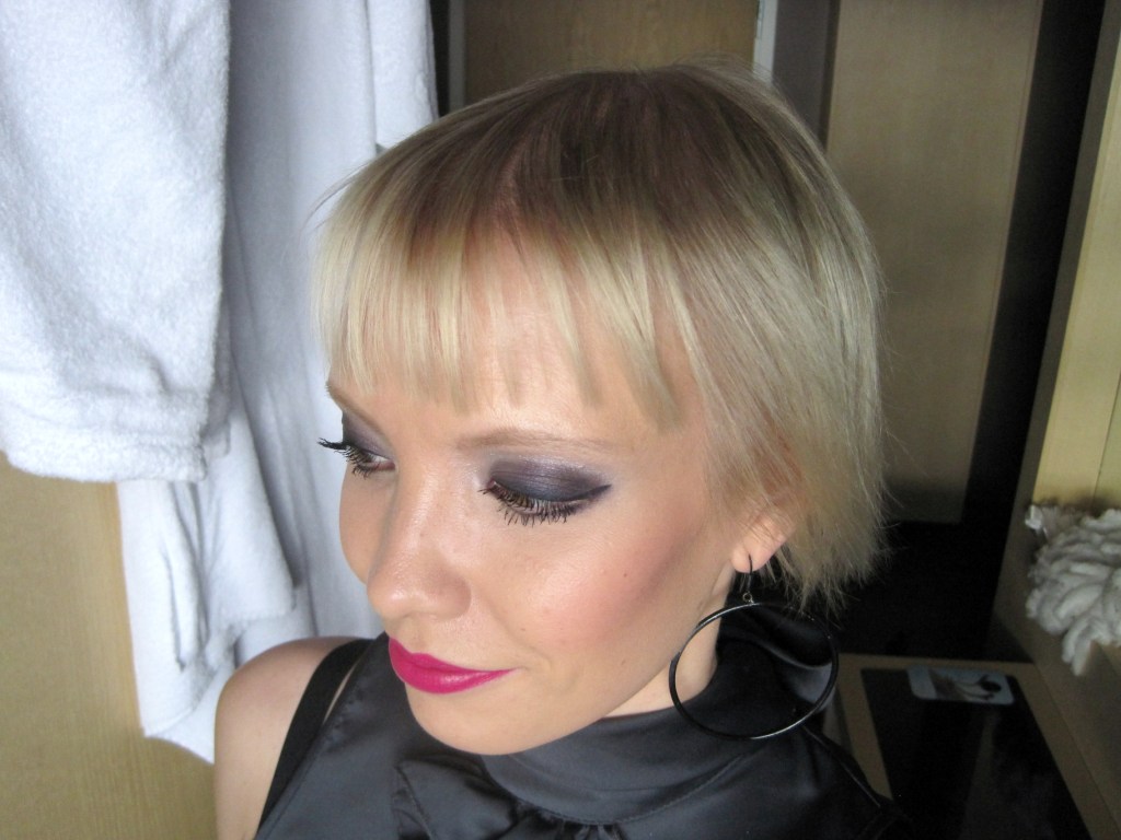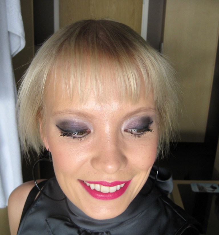 Lauantaina oli sitten THE päivä, ja mun juhlameikki oli tällainen. Alunperin tarkoituksena oli laittaa huulille vaaleahko lila puna, mutta koska asuni oli melko tumma ja suoraan sanottuna tylsä, niin päädyin laittamaan äreän fuksian värisen huulipunan piristysruiskeeksi. Olin tyytyväinen tekemääni meikkiin, harmittaa vaan, kun näissä kuvissa valo on jotenkin ihan kökkö ja silmät näyttävät sini-lilan sijaan ihan harmailta :( Mutta onneksi lopputulos oli parempi luonnossa!