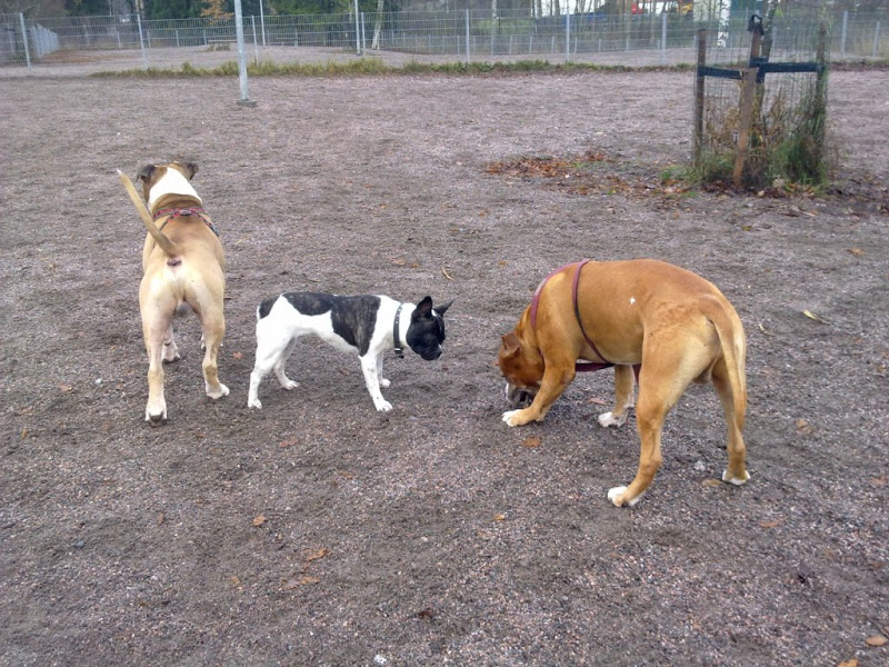Meidän naapurissa asuu Jedi-ranskanbulldoggi. Mulla on joku soft spot ollut aina noihin lyttynaamaisiin bulldoggeihin, ja oonkin hankkinut jonkin asteisen hullun maineen Jedin omistajien silmissä. ”Niin se on se muija, joka aina huutelee parvekkeelta”. Jepjep, just se ;) Oon muutaman kerran varoittanut Jedin omistajia, että saatan dognapata Jedin ja viime sunnuntaina se onnistui ihan luvan kanssa, kun saatiin Jedi lainaksi mukaan meidän kanssa koirapuistoon.