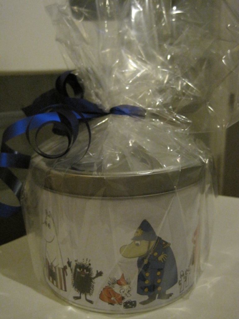 Mä sain tällä viikolla jo ekan joululahjan :) Ihanalta, mammalomalle jäävältä työkaverilta nimittäin. Viime viikonloppuna tuskailin, kun ei ollut mitään kivaa rasiaa vastaleivotuille pipareille, niin söpis Muumirasia tuli oikeasti tarpeeseen!