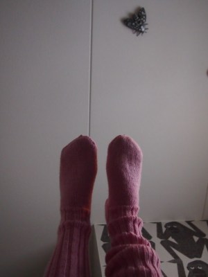 Perjantaina sain Hemulin lisäksi muutakin (sydäntä) lämmittävää, nimittäin työkaverini minulle kutomat pitkävartiset villasukat, joita esittelin teille silloin kuin olivat vielä lankakeriä ;). Ihanat! Tässä välissä kutoja oli ehtinyt jo vaihtaa työpaikkaakin, ja lähetti sukat postissa, että saan ne mahdollisimman pian käyttöön. Ihana ajatus, että talvi kulkee kohti (katkeraa muahhah) loppuaan!