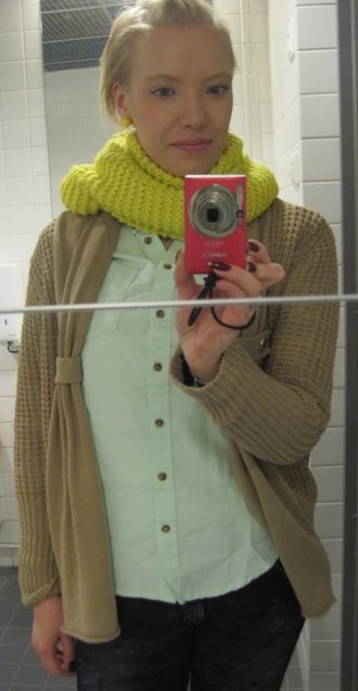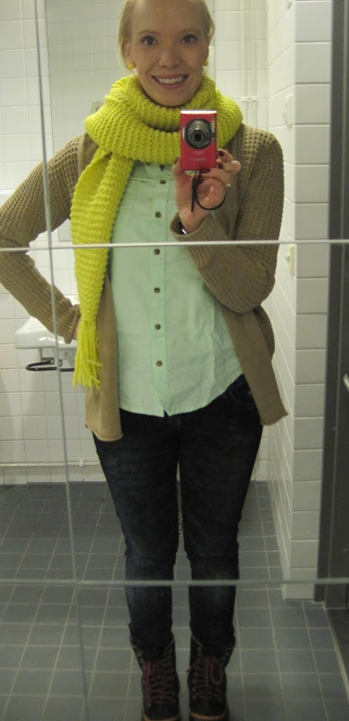 Tsippadai! Mä tilaan yleensä kerran syksyssä ja kerran keväässä vaatteita H&M:n postimyynnistä. Mielestäni H&M livenä ei ole mikään ihana shoppailukokemus (liikaa porukkaa, sotkuiset rekit, isoooooot myymälät), joten tää nettitilaus sopii mulle paremmin. Tällä kertaa kävi loistava tuuri, lähetyksestä löytyi monta aivan ihanaa juttua :) Keltainen huivi oli alessa ja maksoi 2 €, löytö! Lisäksi oon nyt ihan lääpälläni mintunvihreään ja tykästyin tähän rentoon kauluspaitaan heti. Yleensä en juuri kauluspaitoja käytä (paitsi työhaastatteluissa haha), mutta hetki sitten myös H&M:ltä tilaamani farkkupaita ja tämä vihreä paita ovat sopivan rentoja, eivätkä sellaisia virallisia toimistovaatteita, jotka eivät ole mun tyyliä ollenkaan.
