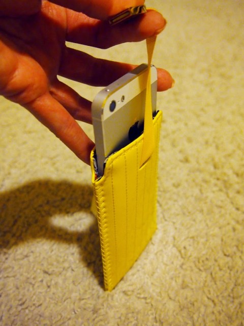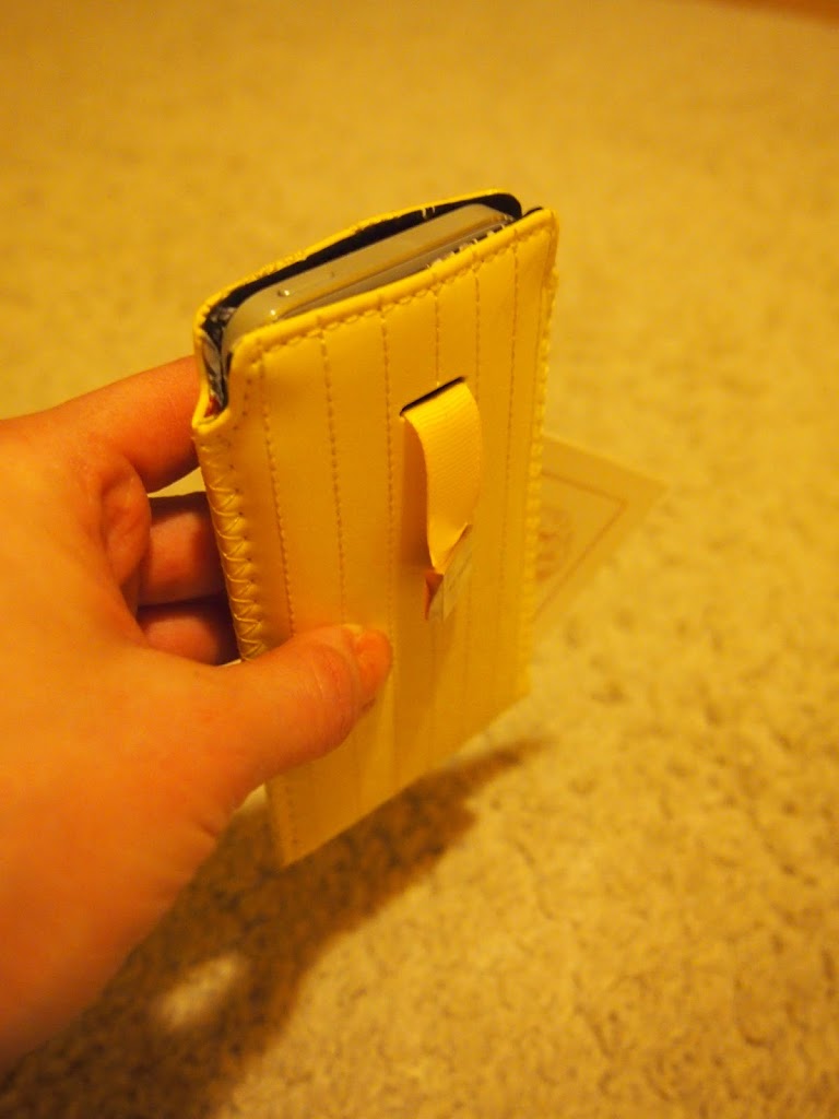Tässä kuvassa väri näkyy ehkä luonnollisimmin, se on todella kirkas! Mä en ensiksi tajunnut ollenkaan mitä virkaa pussukkaan kiinnitetyllä nauhalla oli. Ystävällinen myyjätär valotti, että sitä vetämällä puhelin nousee pussukasta, eikä sitä tarvitse kaivaa sen kummemmin. Kätevää :)