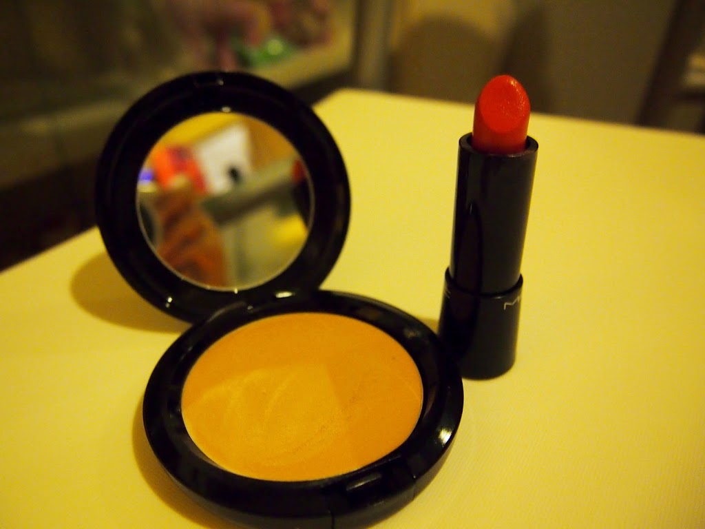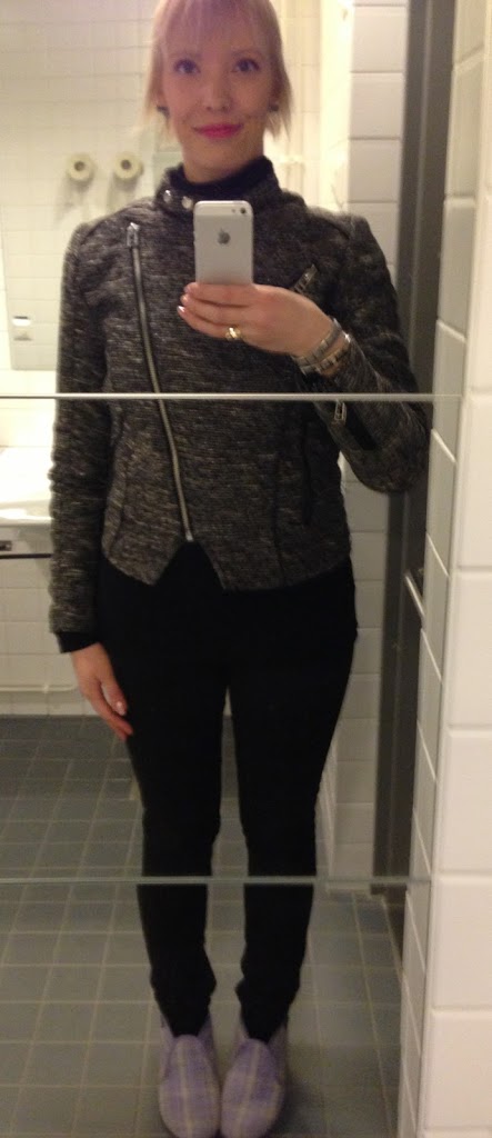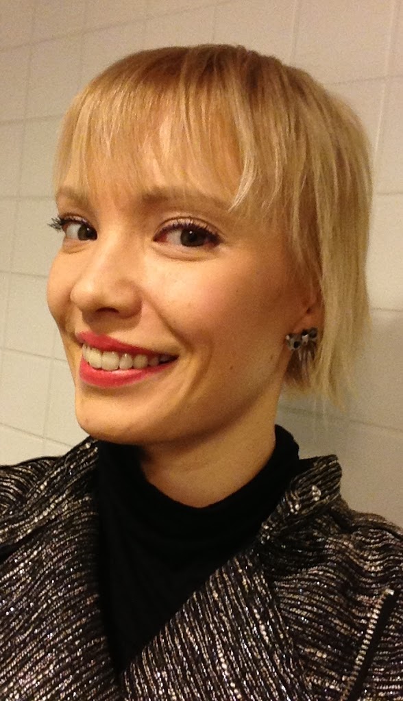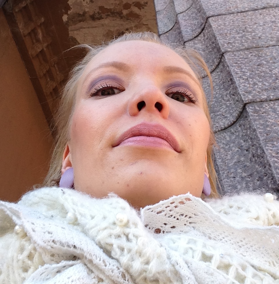 Silmämeikissä oli pieni juju. Luomivako oli väritetty violetilla, mutta muuten luomilla oli vaaleaa voidemaista luomiväriä (MAC Paint pot Painterly). Edestä päin katsottuna meikissä ei näy olevan mitään ihmeellistä, mutta kun katsoin alas tai suljin silmät, näkyi violettia.