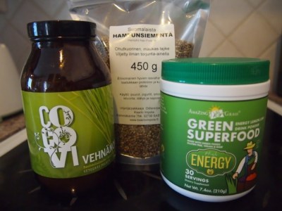 Olen tullut tutuksi Ruohonjuuren ja verkkohyvinvointikauppojen kanssa, joista olen ostanut kuvassa näkyvää vehnänorasjauhetta, viherjauhetta ja hampunsiemeniä. Lisäksi olen saanut siskon stashistä proteiinijauhetta, jota pitää ihan näillä näppäimillä ostaa lisää. Nappimuodossakin on uutta ”ruokaa” tullut nautittua, nimittäin sain kehotuksen ottaa päivittäiseen käyttöön maitohappobakteerit ja omega3-valmisteen.