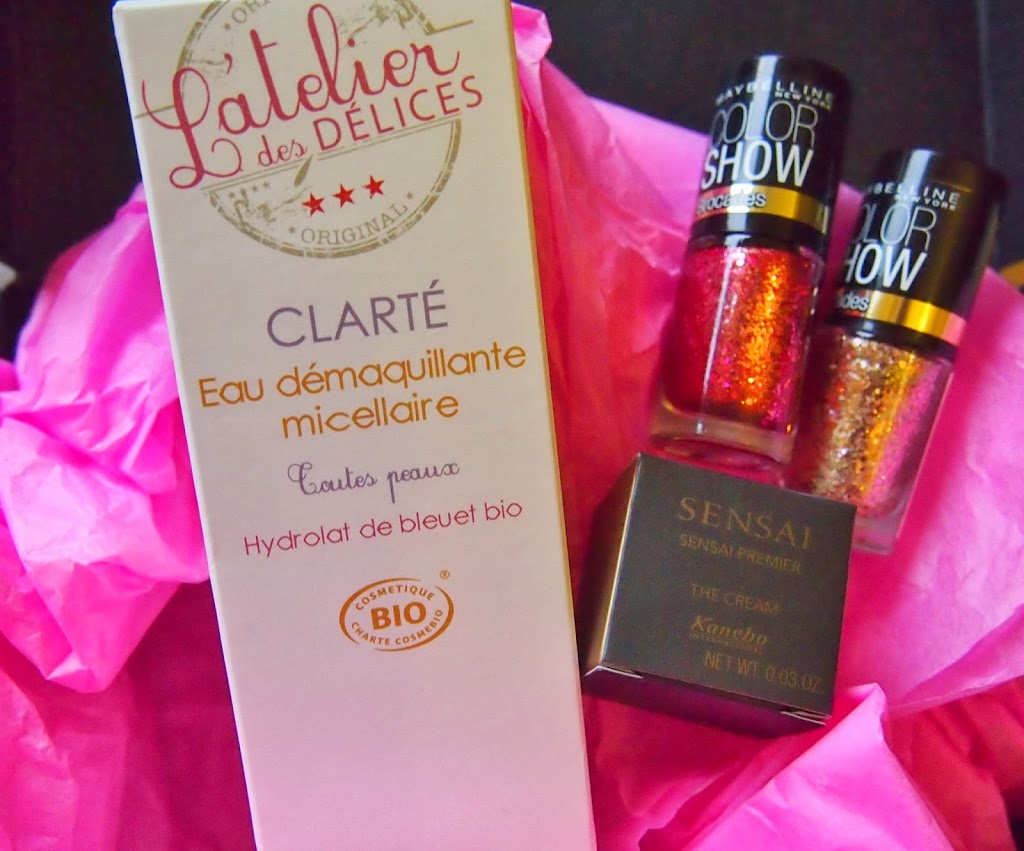 Aikani istuttuani keräilin itseni kasaan ja tutkin paketin sisältöä. Siellä oli L´Atelier des Délicesin misellivesi, molemmat Maybellinen Brocades-kausilakat ja pieni Sensain Premier The Cream.