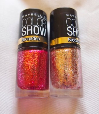 Jos nyt muutun iloisesta paketin saajasta kosmetiikkabloggaajaksi, niin pakko sanoa, että hitto kun näitä Brocadeseja on mahdoton kuvata siten, että niiden ihanuus tallentuisi ja toistuisi oikein! Nämä ovat nimittäin aivan järkyttävän upeita. Punaisessa lakassa on isoja kultaisia glittereitä ja kultaisessa vaaleanpunaisia (juuri tuota vaaleanpunaisuutta on ihan mahdoton saada näkyviin). Hei ihan oikeasti, kultainen ja vaaleanpunainen samassa lakassa. Rakastan! Lakkasin tietenkin kynteni heti Knitted Goldilla, ja voin sanoa vailla epävarmuuden häivääkään, että kyseessä on hienoin koskaan omistamani kynsilakka. Teen uuden lakkauksen jouluksi, ja aion kuvata sitä niin kauan, että saan blogiin esittelykelpoiset kuvat! :)