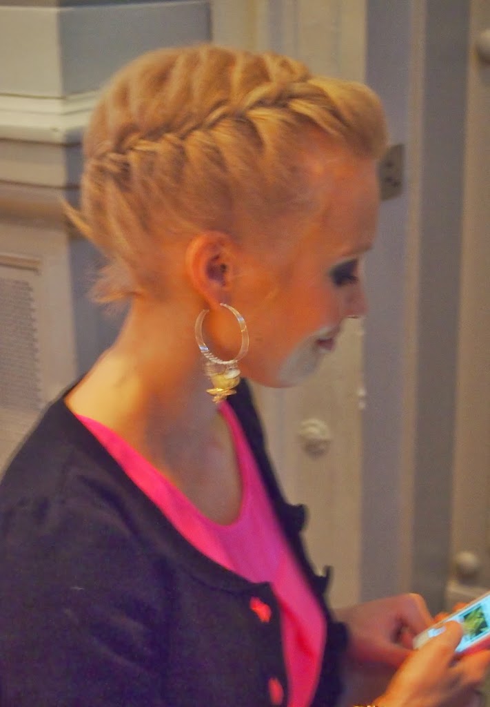 Hiuksista mulla ei ole valitettavasti ole alkuillalta yhtään kuvaa, eikä kunnollista kuvaa ylipäätäänkään. Idea oli kuitenkin se, että mulla oli lettikampaus. Ihan uskomatonta, että tästä tukasta saa koko pään kiertävän ranskanletin! Kun näin lopputuloksen peilistä ensimmäistä kertaa, rupesin nauramaan lähes hysteerisesti, olin niin äimistynyt :) Tulin myös jälleen kerran siihen tulokseen, että meikistä pystyn itsekin tekemään ok:n, mutta hiusten osalta mun ja kampaajan työn jäljessä on ihan hitonmoinen ero.