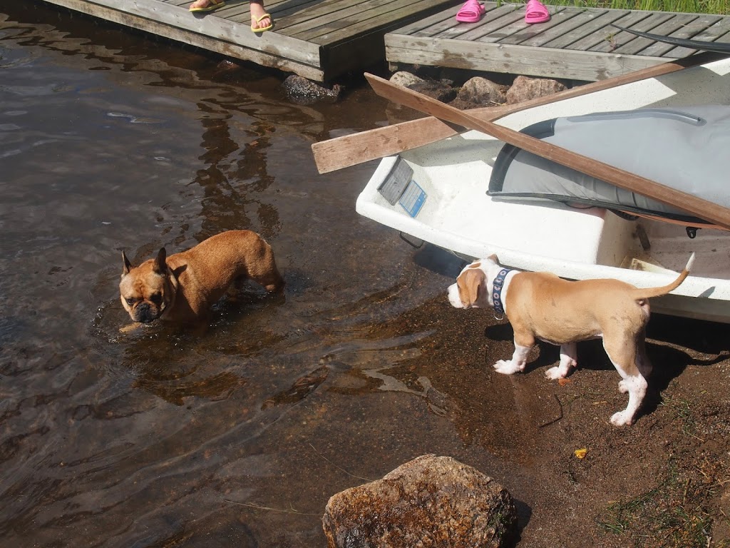 Käynti oli kummallekin ensimmäinen meidän mökillä. Beni on kyllä ollut muutamia kertoja järven rannalla ja uinutkin (kummallakin kerralla hypättyään Rikin perään haha), mutta Toralle kerta veden äärellä oli ensimmäinen. Siinä missä Riki juoksi aina täysiä suoraan autosta järveen, Tora lähinnä ihmetteli uutta jännää paikkaa. Beni sen sijaan juoksi ympäri nurmikkoa ja mökkiä bulldoggimainen hullunkiilto silmissä :D Veteen pojat menivät vasta hetken päästä.