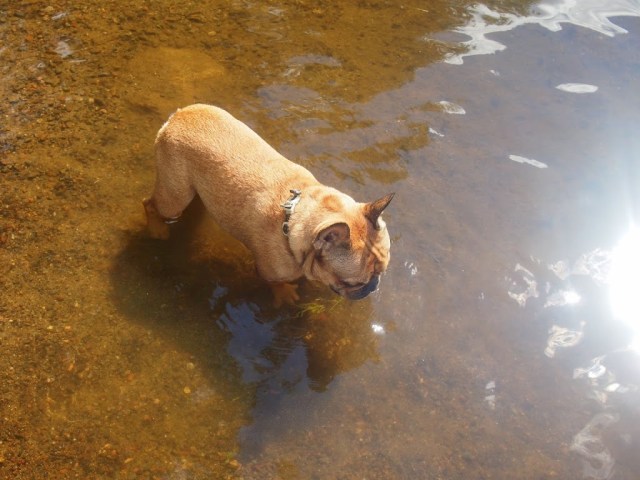 Beni tykkäsi kahlailla ja tutkia vettä, Tora pysytteli sen sijaan aika lailla rannassa. En tehnyt mitään rohkaistakseni (enkä varsinkaan pakottaakseni) sitä veteen, se oli kuitenkin vasta 10 viikkoa vanha, ja aikaa on. Kaikki tuntemani amstaffit ovat uimahulluja, joten eiköhän Torakin vielä uimaan halua :)