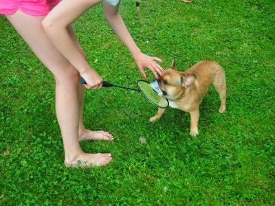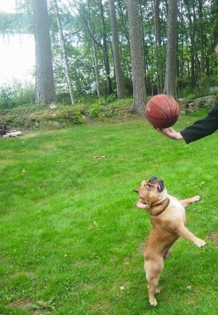 Siinä missä Tora veteli paritkin pitkät päivätorkut, Beni ei malttanut levätä HETKEÄKÄÄN (tyypillistä bulldoggia tämäkin ;) koko päivänä. Sitä ei myöskään jännittänyt yhtään lähteä paikkoihin, joihin se ei meitä ihmisiä nähnyt, vaan huiteli milloin missäkin. Joskus metsästä näkyivät vain sen pystyt korvat =D Benin piti tietenkin osallistua myös sulkapallon ja koriksen pelaamiseen.