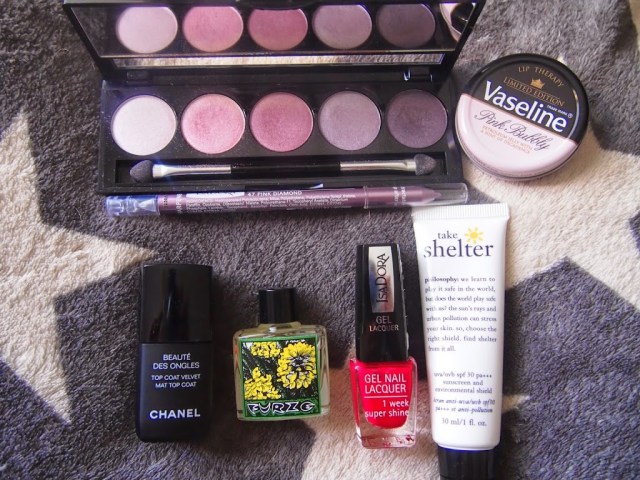 Valkkasin mukaani ihanan violetin IsaDoran Snow Fairy -luomiväripaletin sekä sen kaveriksi loistavasti sopivan IsaDoran Twist-Up Metallic Eye Pen Pink Diamondin. Mukaani lähti myös Vaseline Pink Bubbly -huulirasva, Chanelin mattapäälluslakka, Lushin Furze-tuoksu, IsaDoran geelilakka Scarlet Red ja Philosophyn Take Shelter aurinkovoide kasvoille (SPF 30).
