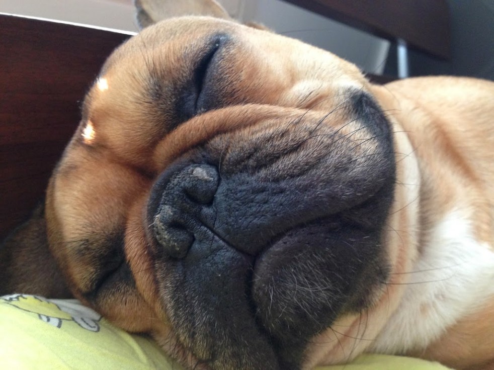 Heräsin kellon soittoon, ja tuttu karvainen naakki ilahdutti mua tyynyllä <3 Beni siis nukkuu useimmiten pää, tai joskus koko koira, mun tyynyllä. Se herää yleensä ensimmäiseen kellon soittoon, ja sitten lempipuuhaamme on viikonloppuisin viettää laatuaikaa eli köllötellä hetki sängyssä ja mä silittelen ja tuoksuttelen pientä bulldoggia. Tora oli yökylässä ja poikakaveri matkoilla, joten meillä oli harvinainen kahdenkeskinen aamu Benkun kanssa :)