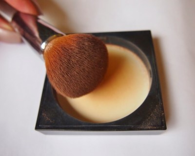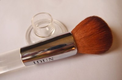 Sitten otetaan kabuki, joka itselläni on Idunin, koska en luonnollisesti omistanut sellaistakaan ennestään ;) Kabukia painetaan kevyesti kantta vasten, ja pyöritellään niin, että puuteri häviää siveltimen sisälle. Siveltimen pinnassa ei pitäisi näkyä puuteria. Olen kokeilemalla huomannut, että paras tapa on kopauttaa puuteria kanteen ja pyöritellä kabukiin ja kasvoille vähän kerrallaan. Toistan tämän yleensä pari kertaa, että saan kasvoille haluamani peiton. Jos puuterin kanssa ahnehtii, niin sivellin ei pysty ”imaisemaan” sitä kaikkea, vaan puuteria pölisee sinne sun tänne. Jos taas puuteria ottaa vähän kerrallaan, kaikki pääsee käyttöön.