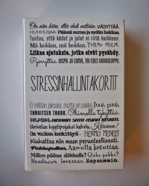 Maanantaijoulukalenterista puolestaan sain stressinhallintakortit. Jotenkin toisaalta kohtalon ivaa, toisaalta loistava sattuma (vaikka en usko sattumiin), että mulla oli maanantaina ”luukun” avatessani päällä aivan jäätävä stressi. Nyt jo vähän huvittaa, että ahdistuin korttipakan kannesta lisää, koska stressaantuneen ihmisen ajatuksia kuvaavat lauseet vaan olivat niin osuvia.