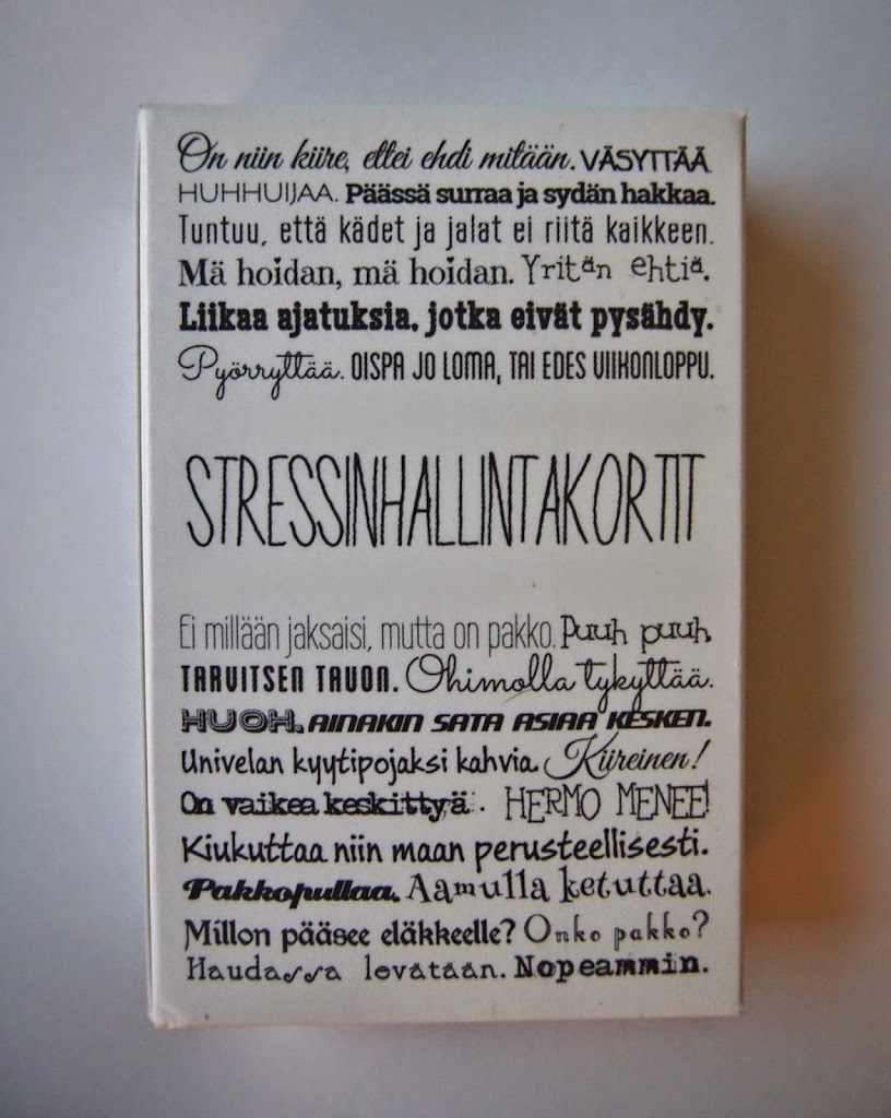 Maanantaijoulukalenterista puolestaan sain stressinhallintakortit. Jotenkin toisaalta kohtalon ivaa, toisaalta loistava sattuma (vaikka en usko sattumiin), että mulla oli maanantaina ”luukun” avatessani päällä aivan jäätävä stressi. Nyt jo vähän huvittaa, että ahdistuin korttipakan kannesta lisää, koska stressaantuneen ihmisen ajatuksia kuvaavat lauseet vaan olivat niin osuvia.