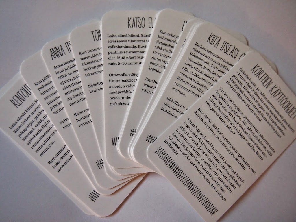 Superstressiä jatkui oikeastaan koko viikko, joten kortit pääsivät välittömästi käyttöön. Vein puolet työpaikalle ja jätin puolet kotiin. Idea on sellainen, että pakasta otetaan stressitilanteessa kortti ja tehdään kortissa lukeva harjoitus. Ohjeissa sanotaan, että pakasta voisi ottaa kortin randomilla, mutta itse olen tykännyt tehdä järjestyksessä, niin tiedän, kun olen käynyt kaikki kortit läpi. Stressinhallinta olisi hyvä saada luontevaksi osaksi arkea, ja näitä harjoituksia voi tehdä juuri niin monta päivässä kuin haluaa. Olen korttien avulla muun muassa päässyt avaruusmatkalle (etäisyyttä omiin huoliin), keskittynyt syvään palleahengitykseen (hengitykseen keskittyminen rentouttaa mieltä ja syvään hengittäminen kehoa) ja käynyt kävelyllä omassa kodissani (keskittyy päässä pyörivien ajatusten sijaan esimerkiksi siihen, minkä harmaan sävyinen tuo tapetti olikaan).