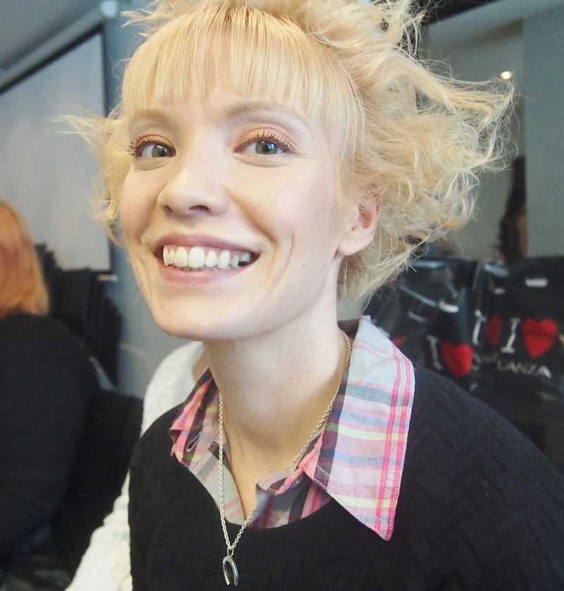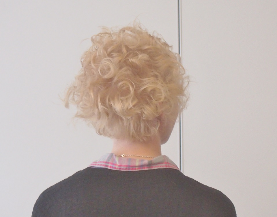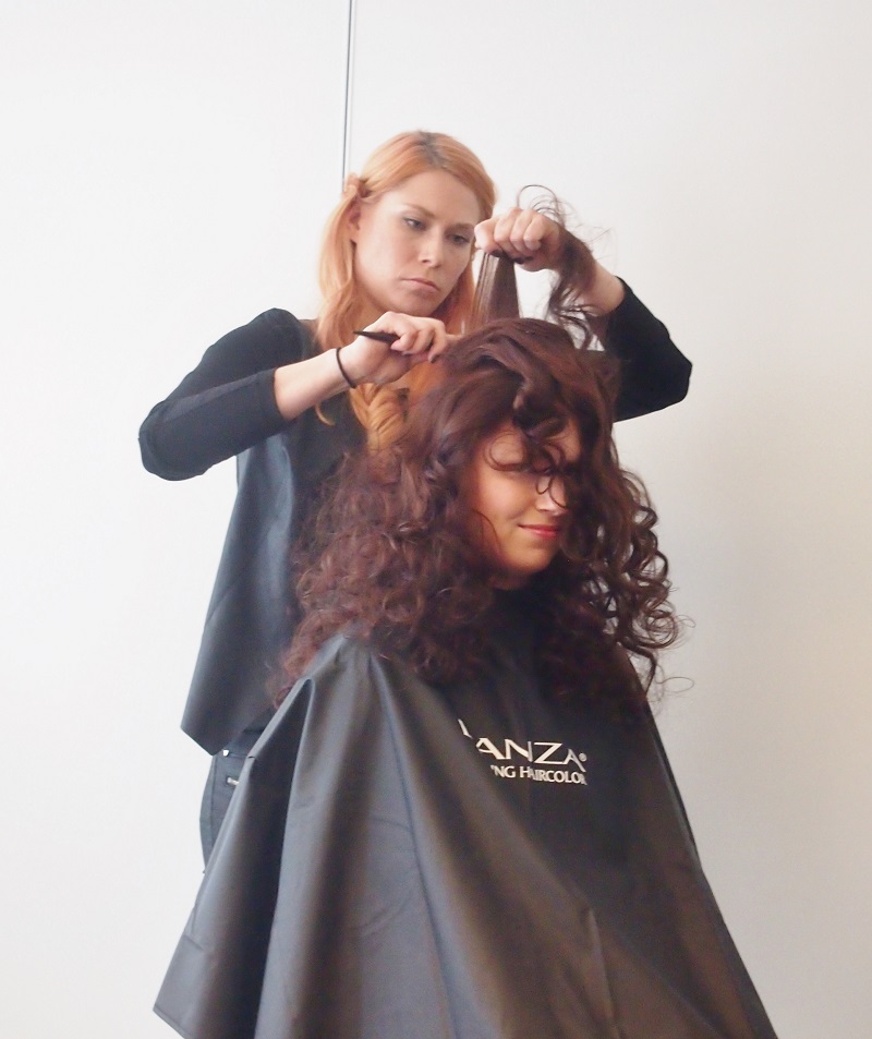 Johan halusi tehdä mulle kiharakampauksen, joka olisi funky. Hän suihkutti pohjalle Dry Texture Sprayta (jota taidettiin käyttää melkein kaikille muillekin malleille) imemään pois öljyisyyttä tyvestä ja antamaan rakennetta ja tuuheutta. Tuotetta sanotaan ”tukan tuplaajaksi” ja se sisältää myös lämpösuojan kuten kaikki L´anzan muotoilutuotteet! Ihan loistava juttu, nimittäin lämpösuojaa EI saa unohtaa jos käyttää fööniä tai muotoilurautaa! :) Sitten vain suoristusraudalla mummokiharaa pää täyteen. Näin lyhyt tukka tosiaan kihartuu ihan tuonne pään ympärille, mutta kiharaa saa kyllä helposti loivemmaksi, se ei ole ongelma.