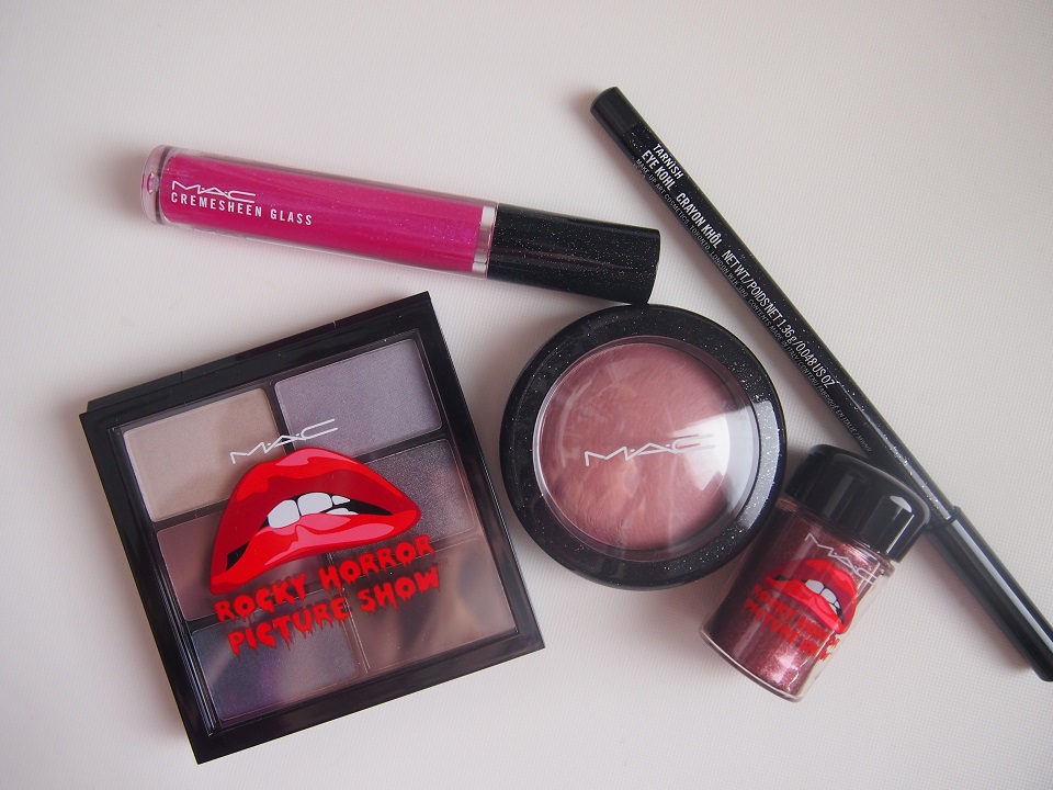 Tässä vaiheessa, kun olimme ylittäneet meille varatun ajan jo tunnilla, meille kiikutettiin vielä lahjarasialliset MACiä. Limited Edition MACiä, huokaus. Mukana oli luomiväripaletti ja pigmentti Rocky Horror Picture Show -kokoelmasta, joka ei edes ikinä tullut Suomeen, sekä poskipuna, huulikiilto ja silmänrajauskynä Heirloom Mix -kokoelmasta.