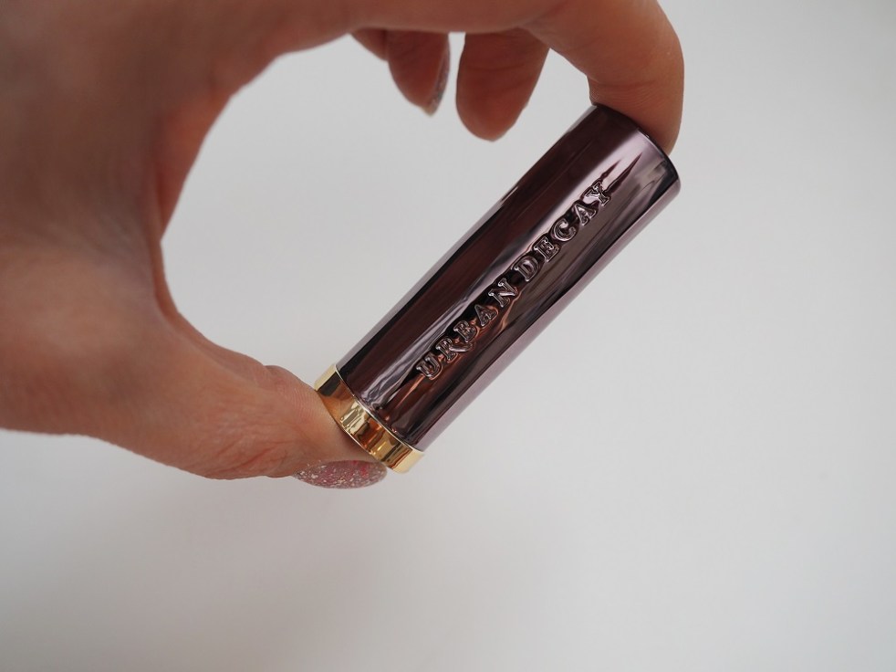 Hylsy on hyvin UD:n tyyliin sopiva, hieman rouhea mutta tyylikäs. Ihanaa vaihtelua MACin mustiin hylsyihin verrattuna ;)