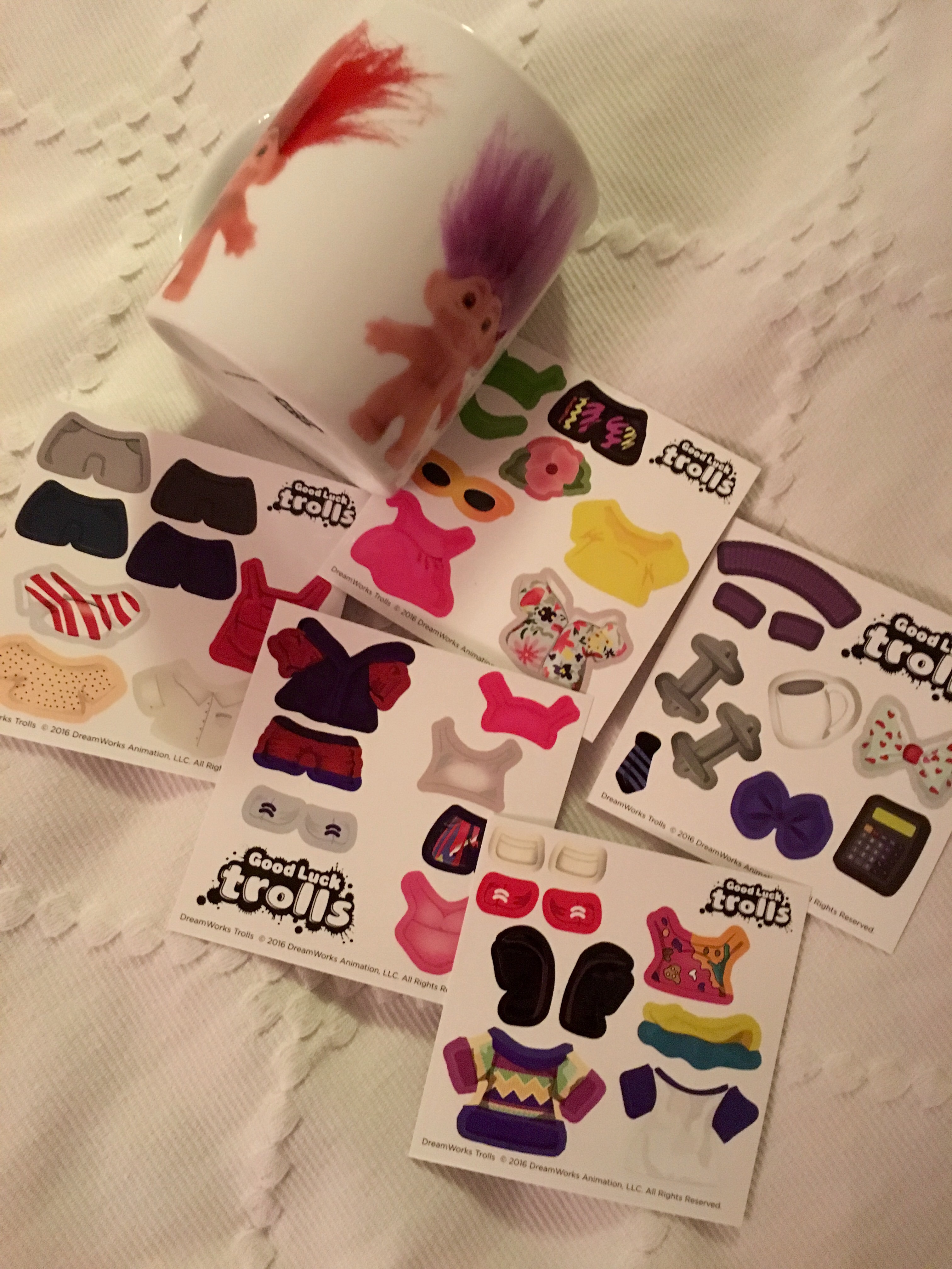 Trollimuki!! Jossa on kolme trollia ja mukana viisi arkkia uudelleen kiinnitettäviä tarroja <3 Trolleille eri vaatteita! Olin ihan pähkinöinä tästä!
