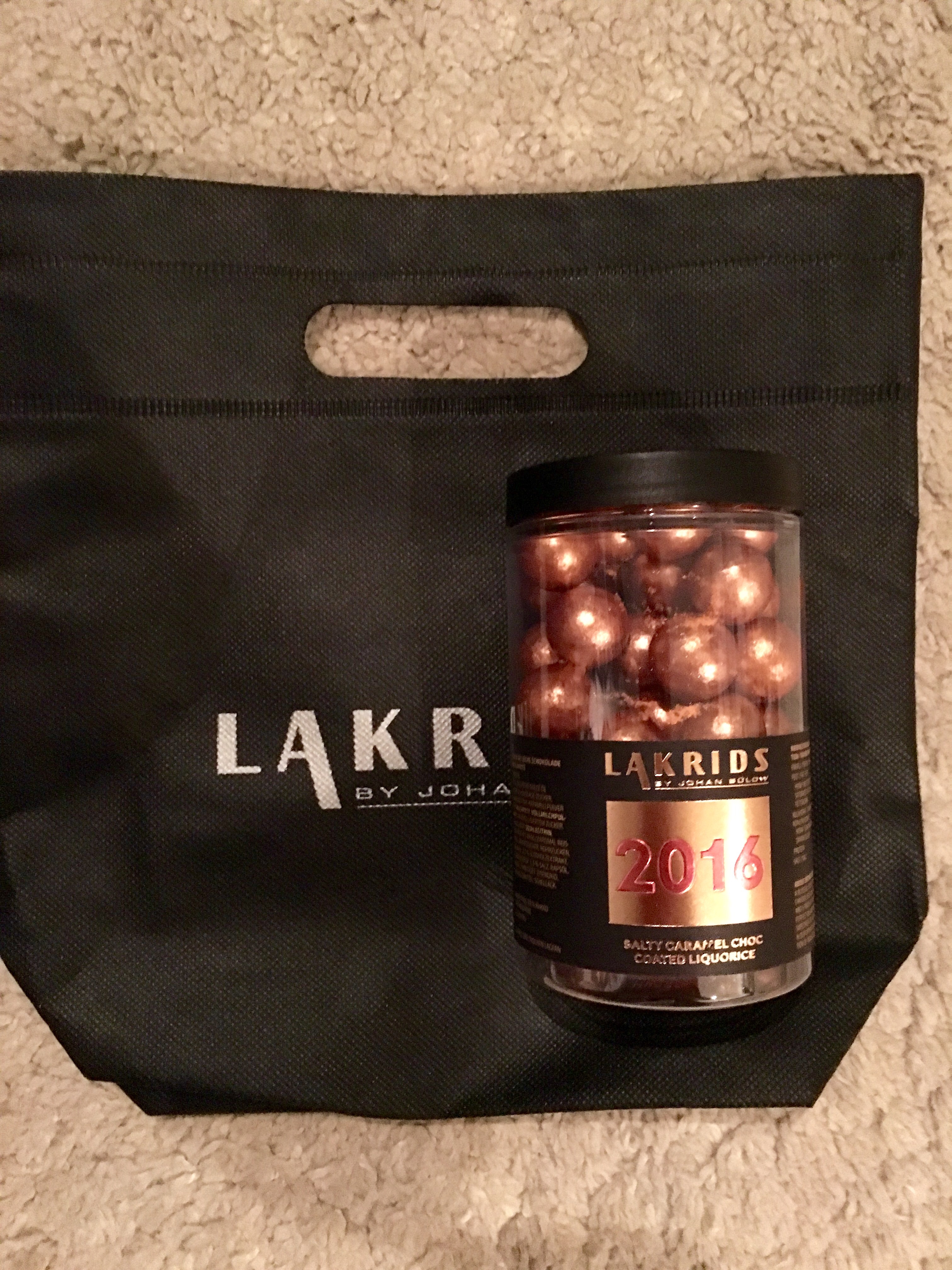 Lakrids. Toivon mukaan olen näitäkin ehtinyt hehkuttaa Instassa tai blogissa?! Nimittäin merkin ”perus” kuulat ovat olleet mun lemppareita jo vuosia. Lakupallon päällä on suklaakerros kuorrutettuna salmiakkijauholla, ja maku on jotain tosi koukuttavaa. Näitä ruusukultaisia kuulia oli Kastrupin lentokentällä maistiaisena ja oli muuten niin namia, että ostin itselleni tällaisen rasian odottamaan joulua ^_^ Salmiakkijauhon tilalla näissä on suolakaramellia. Lakridseja saa meiltä Suomestakin ainakin Stockmannilta, suosittelen herkkusuille. Kalliita ovat kuin mitkäkin, mutta joka pennin arvoisia.