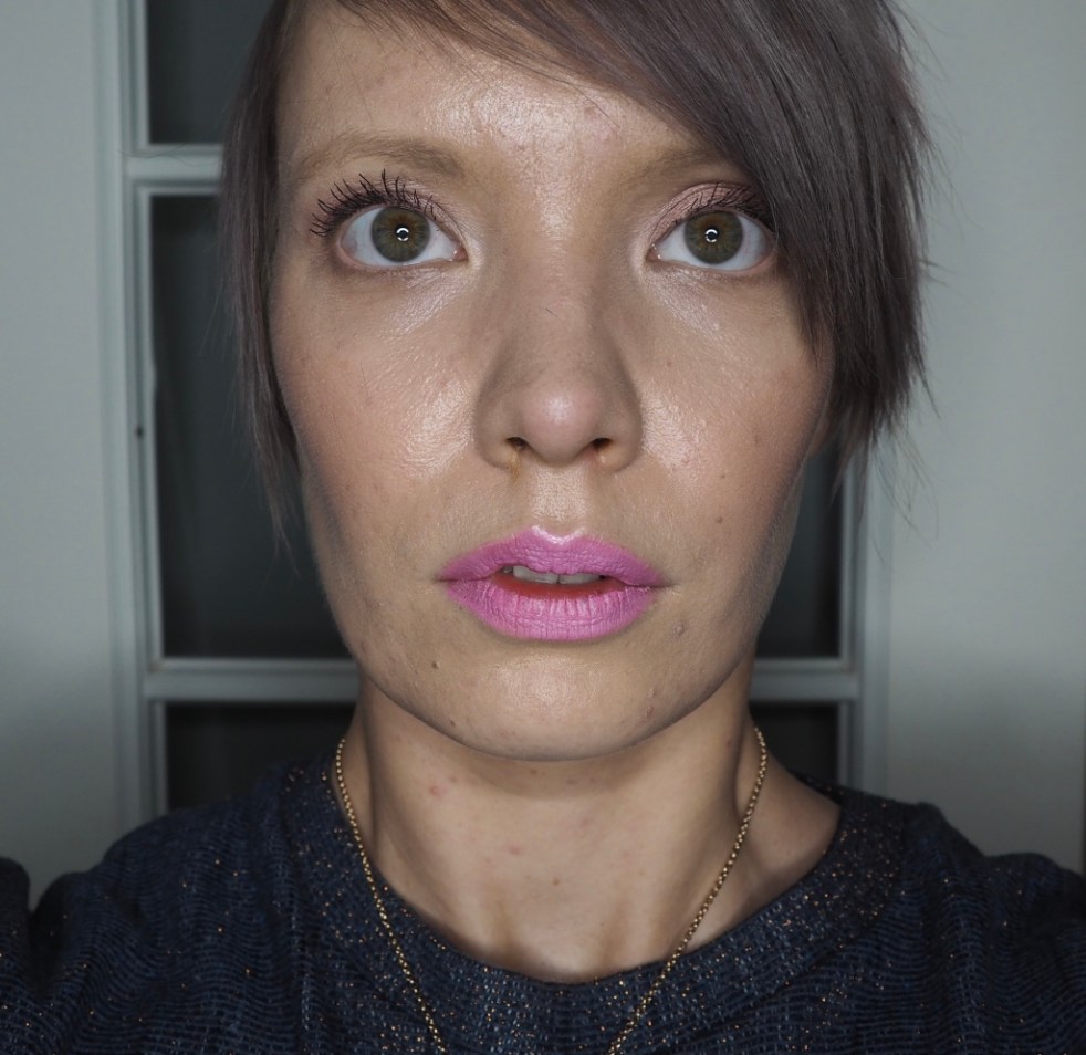 Näissä kuvissa meikki on ollut naamassa nelisentoista tuntia ja silmistä näkee, että oon ihan puhki. Jos nämä seikat jättää huomiotta, niin mä huomasin heti uutta päätäni katsellessa, että tämä hieman tummempi sävy kehystää kasvoja tosi nätisti ja antaa eloa kalpealle talvinaamalle. Tämä oli toki ollut Tiinan tarkoituskin, mutta maallikko tajuaa asian vasta kun näkee ;)