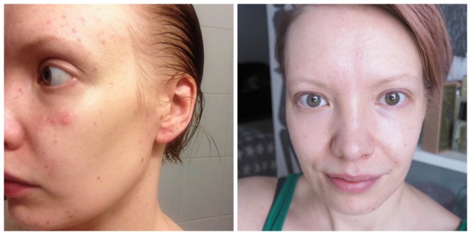 Näillä kuvilla on eroa noin 10 kuukautta. Ero on aikamoinen. Näppylöiden vähentymisen lisäksi ihoni on nykyisin paljon kirkkaampi myös niistä kohdista, joissa ei näppyongelmaa ollut. Ero on kyllä ihan huikea omaan silmääni. En sitten tiedä, miten hyvin olin aiemmin saanut meikillä iho-ongelmani piiloon, että miten asia välittyy sinne ruudun taakse?