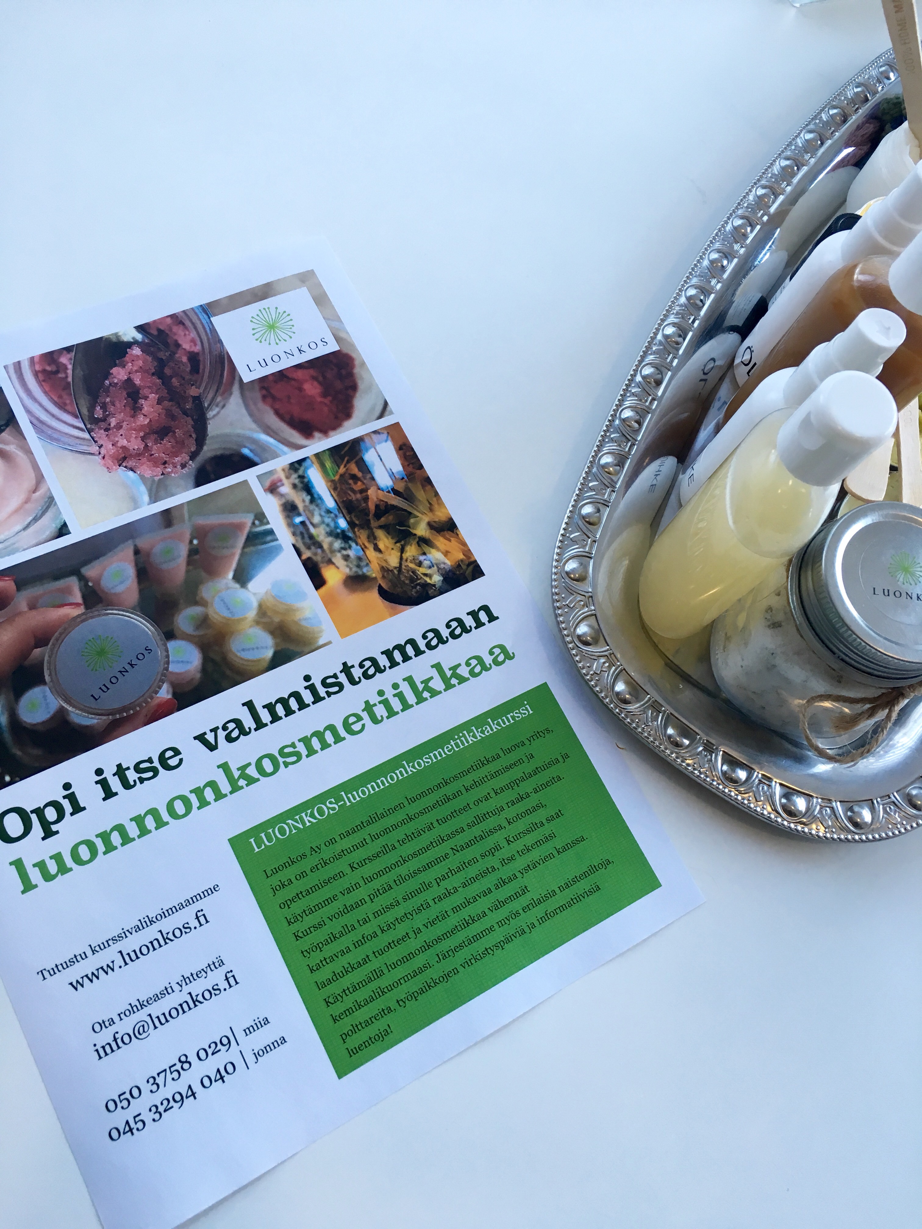 Niin kuin monesti hyvät asiat, tämäkin sattui kohdalleni mutkan kautta ja sattumalta (vaikka en uskokaan sattumaan haha). Luonkos-nimisestä yrityksestä tarjottiin mahdollisuutta tutustua heidän järjestämiinsä luonnonkosmetiikan tekokursseihin niin, että sain kutsua tilaisuuteen bloggaajakavereita ja pääsimme yhdessä tekemään. Meitä oli yhteensä kuusi bloggaajaa ja ryhmän pieni koko oli kyllä ihan perusteltu ;)