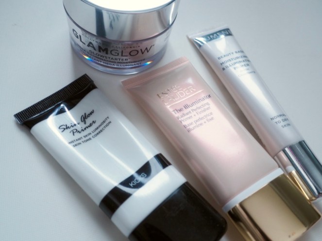 Alhaalta ylös: Kicks Skin Glow Primer, Estee Lauder The Illuminator, Lumene Moisturizing & Illuminating Primer ja GlamGlow Glowstarter Nude Glow.