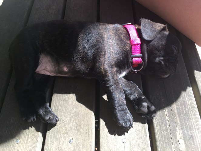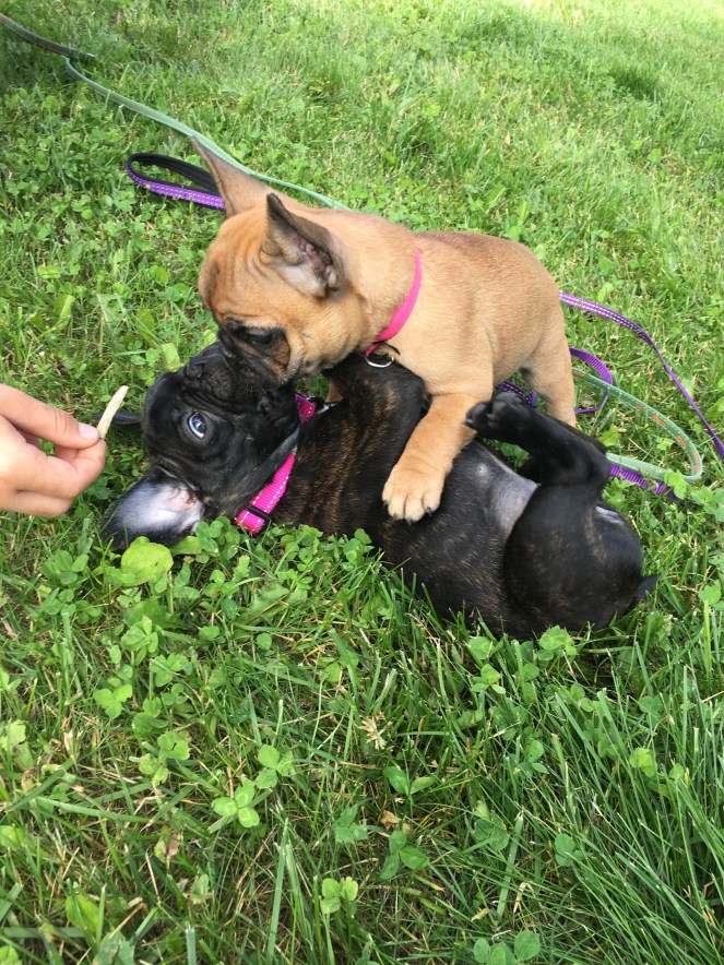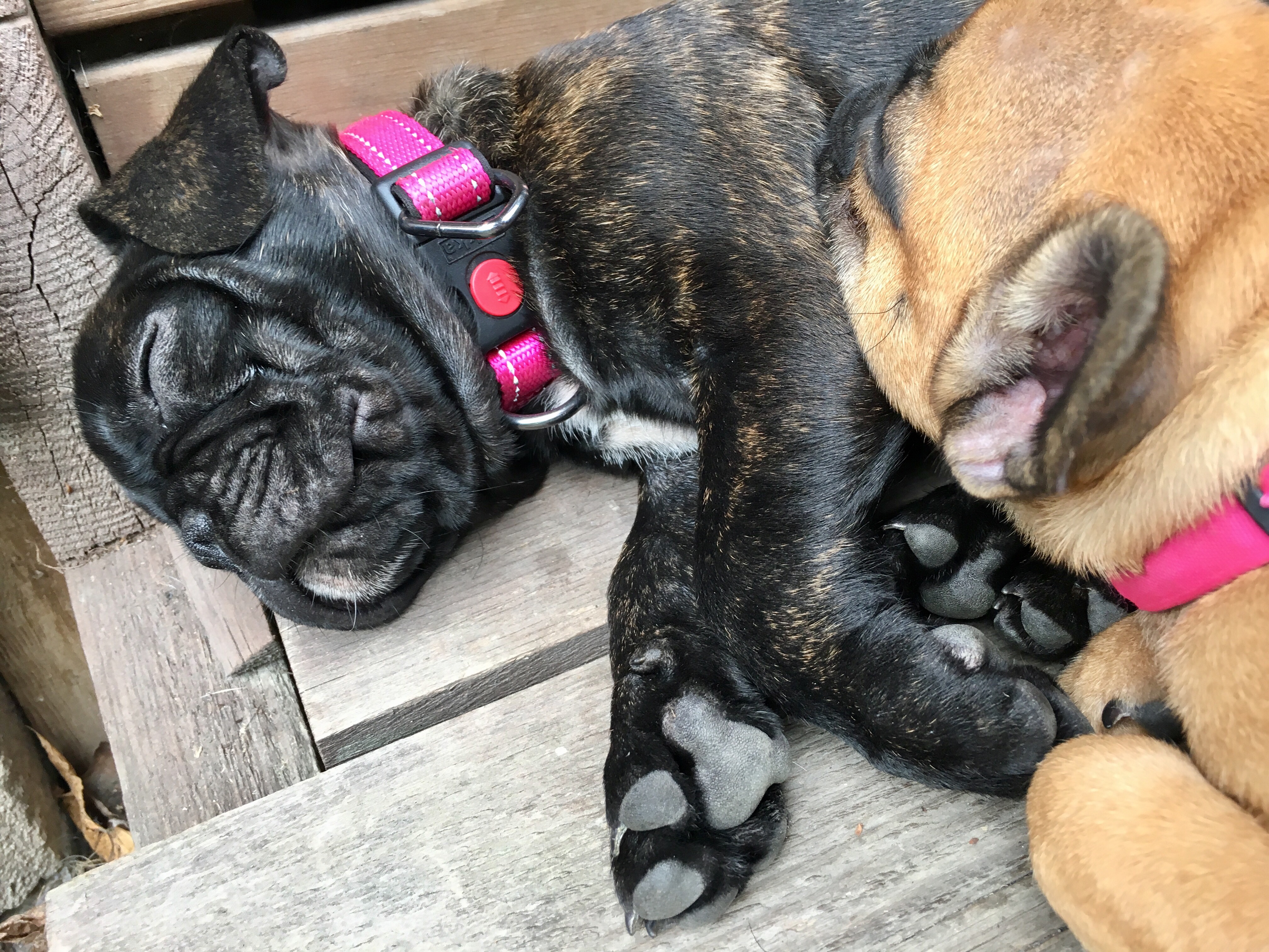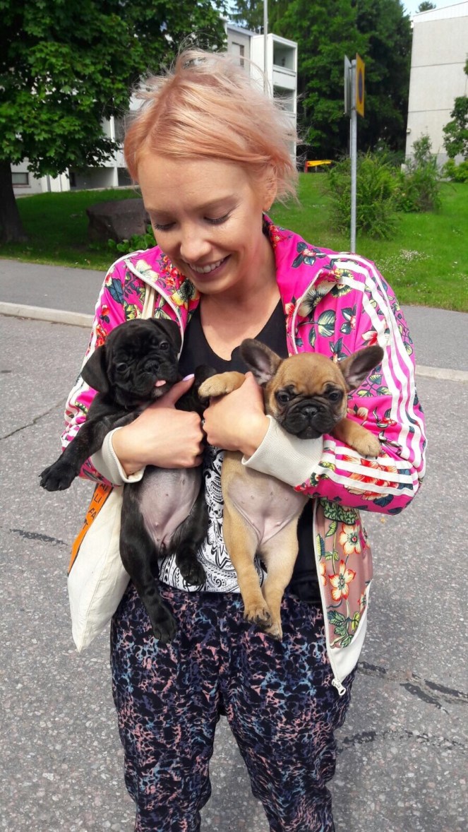 Bulldoggisiskokset korostavat toistensa huonoja puolia! Fiona tykkäilee nukkumisesta enemmän, mutta sen sijaan, että antaisi sen nukkua, Kira hyppii sen päälle, vetää korvasta ja rellestää niin kauan, että Fionakin innostuu riehumaan. Taas. Oikeasti se meteli, mitä kaksi kolmekiloista tyyppiä pystyy pitämään on ihan uskomaton!! Pääkallot kolisee kaakeleihin, naskalihampaat koiraporttiin ja pattereihin ja leikin tiimellyksessä tulee haukuttuakin aika runsaasti. Fiona sitten haluaisi aina olla isojen koirien ja ihmisten seurassa, eikä malta aina edes syödä ruokaa loppuun koiraportin takana ilman, että on pakko vinkua päääästäkääää mut ulooooos! Lenkillä Fiona taas oikein juoksee eteenpäin ja Kiraa saa jatkuvasti nykiä ja houkutella eteenpäin kun se löytää maasta jotain kiinnostavaa. Varsinaisia oman luonteisiaan veitikoita siis :’D
