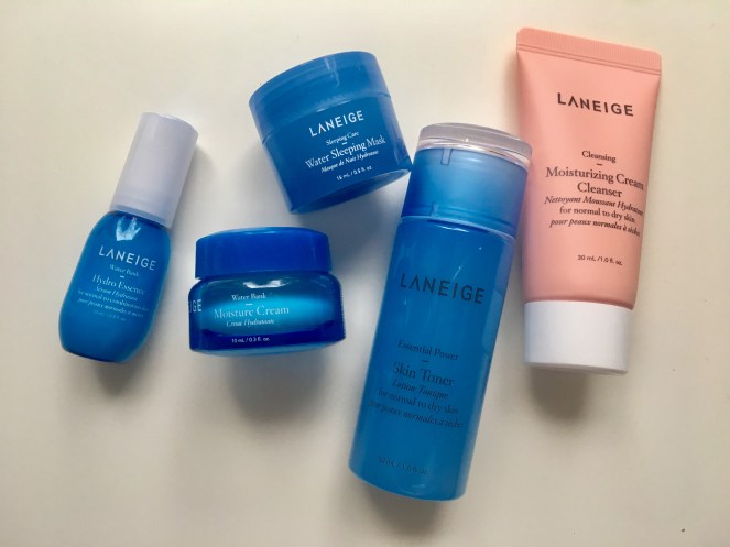 Kuvassa näkyvä Laneigen kokeilupakkaus sisältää yönaamion, hoitonesteen, kosteusvoiteen, kasvoveden ja voidemaisen putsarin. Tykkään muutenkin matkakokoisista tuotteista ja varsinkin kun tutustuu ihan uuteen merkkiin, tämmöinen on ihan kymppi! Tuotteista olen kokeillut vasta yönaamiota, mutta se saakin varauksettoman hyväksynnän. Imeytyy äkkiä, eikä nassu tartu tyynyyn. Olen laittanut Water Sleeping Maskin päälle vielä öljyn, niin iho kiittää aamulla :)