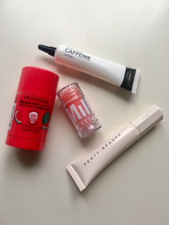 Vielä hieman kasvotuotteita! Tässä kuvassa kiteytyy itse asiassa aika moni Sephora-neuvo :) Puikkoon pakatut tuotteet ovat trendi-ilmiö tällä hetkellä ja halusin toki kokeilla Sephoran oman brändin Watermelon Mask Stickiä ja Milk Makeupin seerumipuikkoa. Vaikka jotkut Sephorat ovat aika pieniä, niissä on aina juuri ennen kassoja hyllyjä, joiden parissa itse vietän eniten aikaa :D Nimittäin matkakokoisia tuotteita, tuotepakkauksia ja esimerkiksi Milk Makeupilta ei ollut koko Rodoksen Sephorassa mitään myynnissä muuten (jos löydät, niin tsekkaa!), mutta näiltä taikahyllyiltä löysin tämän seerumistickin. Samoin The Inkey Listin kofeiinisilmänympärysseerumi löytyi näiltä hyllyiltä. Tutummilta merkeiltä mm. Benefitiltä, Narsilta ja Fenty Beautylta löytyy aina kivoja pikkutuotteita ja settejä <3