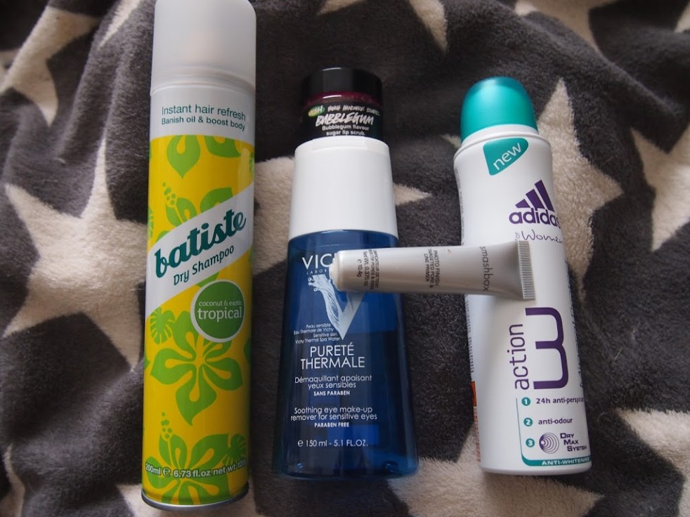 Kroppaan lotrailen enimmäkseen after sun -tuotteita, mutta otan pari pientä Apobasen perusvoidetuubia lähinnä tujummaksi rasvaksi tatuointia varten. Suihkutuotteita on varmaankin hotellissa valmiina, mutta otan varppariksi oman L´Occitanen Fleurs Merveilleuses -suihkugeelin ja pienen Korresin näytepussin. Blistexin Protect Plus -huulirasvassa on sk 30 (huulet palavat tosi helposti!) ja Burt`s Beesin sitruunainen kynsinauhavoide sopii kokonsa vuoksi mukaan loistavasti. Lisäksi nappaan mukaan Kiehl`sin käsivoidenäytepussin.