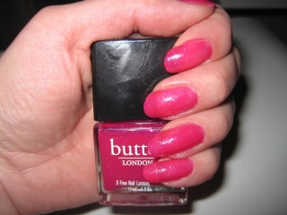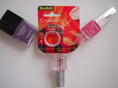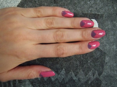 Seuraavaksi mä halusin tehdä lakkauksen teippitekniikalla. En kuitenkaan ottanut huomioon sitä, että jos alle jäävässä lakassa on hileitä, lopputulos ei ole sileä. Lisäksi alla oleva Butter London No More Waity, Katie on pysyvyydessään aivan luokattoman huono (en muistanut asiaa, vaikka olen postannutkin siitä), vaikka yleensä Butterin lakat kestävät aika kivasti. Tämä lakkaus meni siis ihan metsään. Kaveri sen sijaan laittoi alle OPI Pink-A-Doodlea ja kynsien kärkiin OPI Pink Yet Lavenderia. Lopputulos oli tosi tosi kiva :)