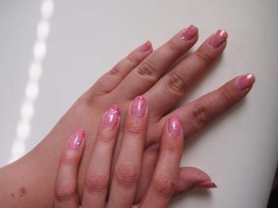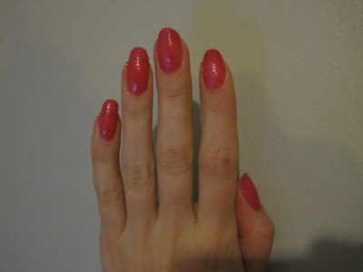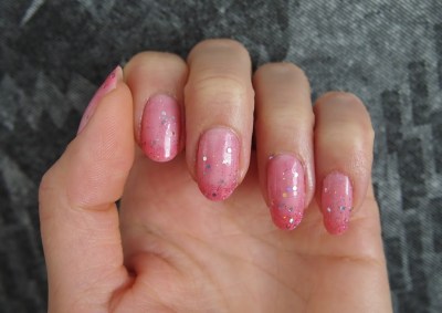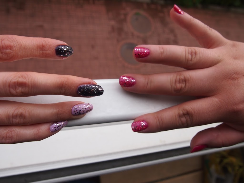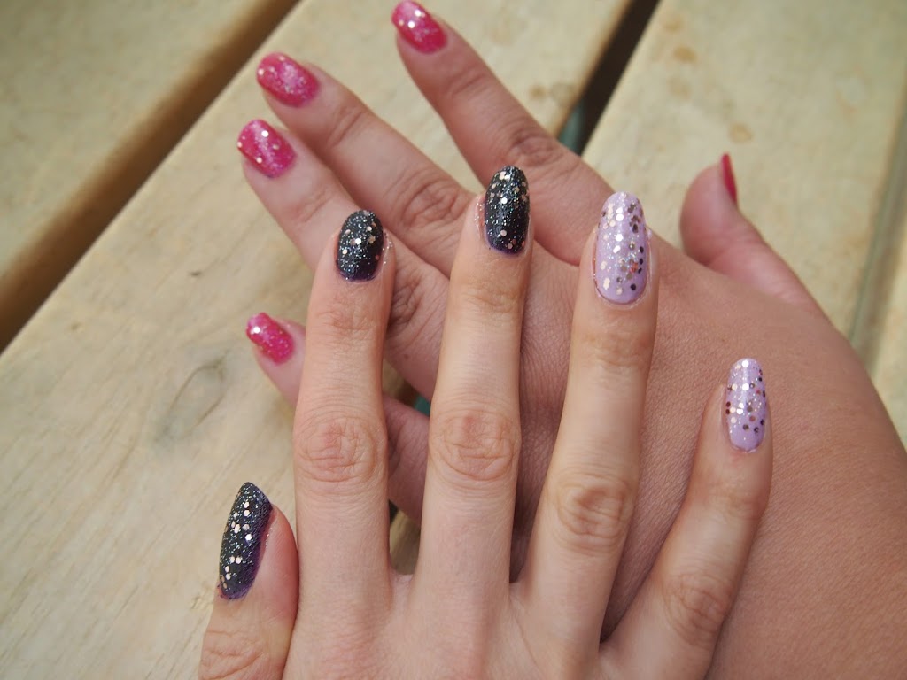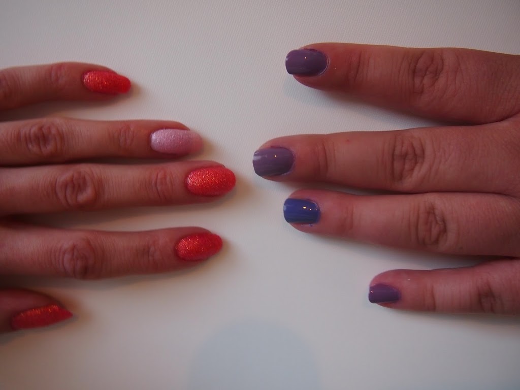 Toisen studion tuotokset näyttävät tältä :) Kaveri laittoi ihanan pinkkiä Butter Londonin Disco Bisquitia alle, ja OPIn Pink Yet Lavender -hilelakkaa päälle. Mä halusin testata viimeistä kokeilematta olevaa OPI Bond Girls Vesper -lakkaani ja laittaa kahteen kynteen vaaleampaa violettia. Valitettavasti Vesper oli mielestäni aivan kauheaa, siinä ei ollut minkäänlaista hohdetta tai hilettä, vaan se oli ihan mattainen. Pinta oli röpelöinen, kuten hiekkalakassa tietysti on, mutta tulos näytti ihan siltä, että olisin mennyt märillä kynsilakoilla nukkumaan ja kynsiin olisi jääneet tyynyn kuvat. Laitoin sitten hätäpäissäni kaikkiin kynsiin samaa OPIn hilelakkaa kuin kaverinikin, ja lopputulos pelastui joten kuten :)