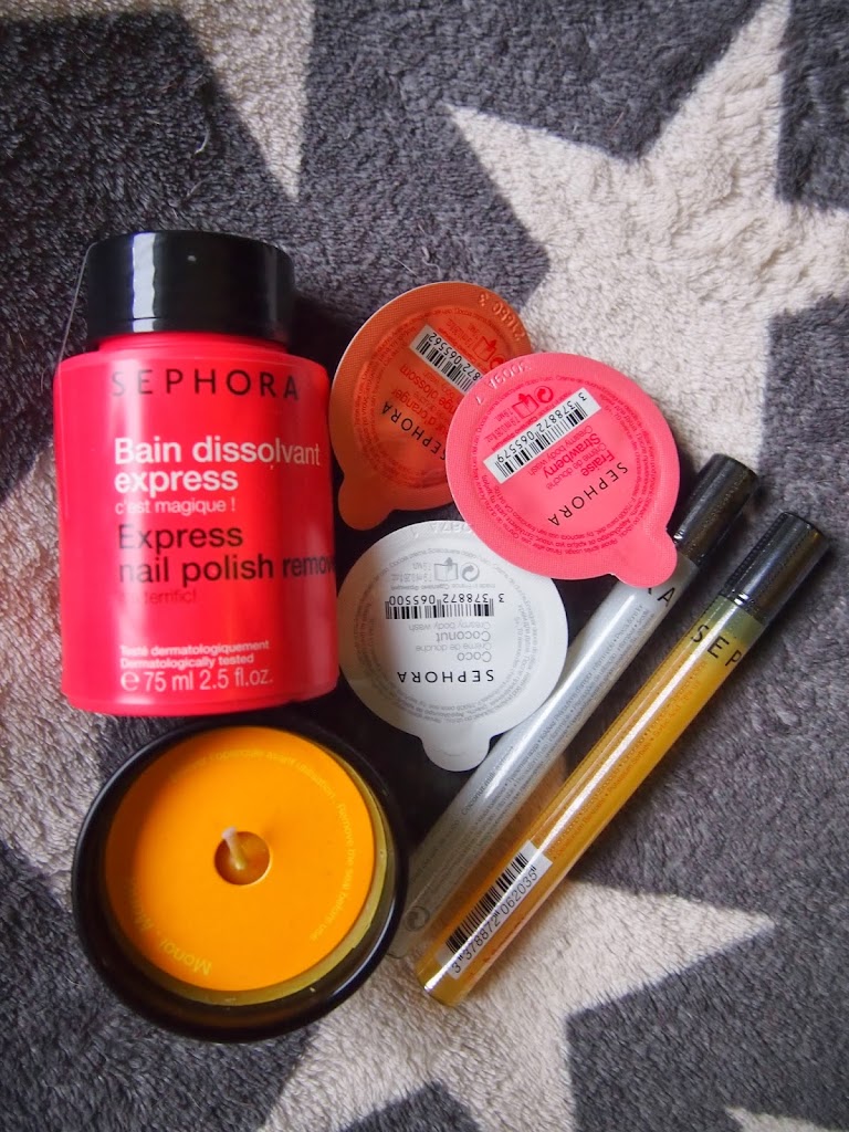 Sephoran omia tuotteita ostin yhden pienen kookossuihkuvoiteen, jotta voin testata tuoksun ennen mahdollista ison tuubin ostamista :) Tykkään Sepon suihkuvoiteiden koostumuksesta ihan simona, ja tuoksuvaihtoehtoja on miljoona. Ostin lisää dödöpyyhkeitä, jotka muuten ovat aivan älyttömän hyviä! Suosittelen lämpimästi nappaamaan mukaan, jos käytte liikkeessä! Otin myös kokeiluun kätevän minideodorantin, jolta odotan dödöpyyhkeisiin ihastuneena paljon. Uutena liikkeeseen oli tullut kangaskasvonaamioita, jollaisen ostin tietenkin. Versio on antioxidant & energizing :) Dödöjuttujen hintoja en muista, mutta suihkuvoide maksoi 60 senttiä ja naamio 2,50 €.