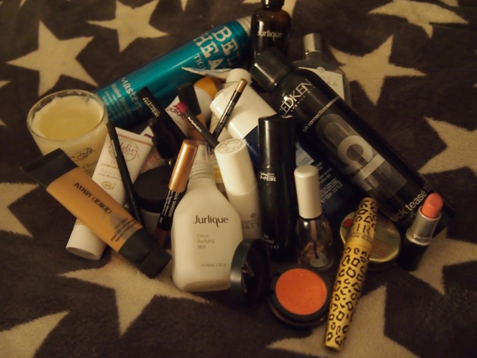 Tadaa! Vai pitäiskö sanoa apua? Toteutin aikeeni pitää yhden päivän ajan kirjaa joka ikisestä tuotteesta, jota naamaani ja kroppaani tungin. Tässä ovat siis tuotteet, joita käytin eilen maanantaina. Yhteensä 27 tuotetta, joista 11 on meikkituotteita, 2 hiustuotteita, 1 suihkugeeli ja loput 13 ihonhoitotuotteita. Enpä olisi kyllä rehellisesti sanottuna uskonut, että noita on noin paljon! ;D Kun päässäni laskin aiemmin, niin kummasti tuotteista unohtuu vaikka kuinka monta sellaista ei-pakollista tai kausittaisesti käytettyä tuotetta. Niin kuin nyt esimerkiksi kasvoöljy, jota käytän nenän pieliin, etteivät ne rohtuisi niistämisestä.