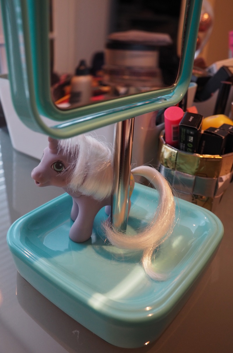 Kuvassa ei ollut tarkoitus demonstroida mun meikkipisteen sekasotkua vaan uutta söpöä peiliäni. Olen välillä katsellut tällaista pöytäpeiliä marketeista ja netistä, mutta monesti ne ovat maksaneet kolmisenkymppiä, tai sitten olleet jotenkin tosi epäkäytännöllisiä. Tämä peili maksoi 8 euroa ja on tosi hauskan näköinen kaveri piristämässä aamujani. Väri on muuten oikeasti ihan kirkas turkoosi, en tiedä miten se muuttui kuvassa tuollaiseksi ”savuiseksi”. Peiliosan korkeus on 20 cm ja toisella puolella on suurentava puoli. Itse käytän vain normaalia puolta haha, se riittää ;) Peilin jalassa saa vuoronperään seistä joku poneistani katselemassa.