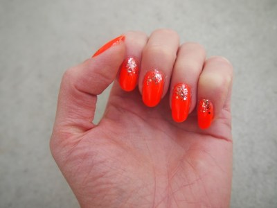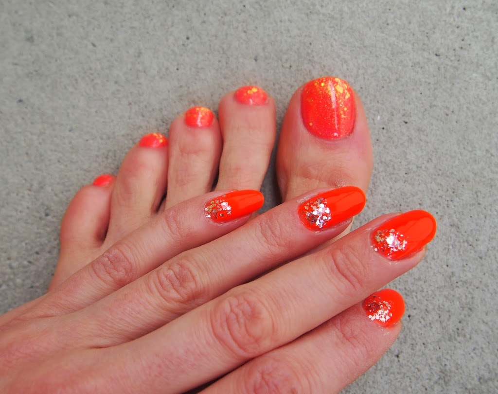 Mietin ensin jonkinlaista liukuvärjäystä, että kynnen kasvu ei näkyisi niin selkeästi. Kauneushoitolan omistaja kuitenkin selitti, että se ei varpaissa näytä välttämättä kovin kauniilta, koska varpaiden kokoero toisiinsa nähden on niin iso, ja pienimmät varpaat niin pienet, ettei sinne paljon värieroja mahdu. Ranskalainen manikyyri tai muu neutraali juttu ei ole yhtään mua, joten otin sitten tällaiset kirkkaat bling-oranssit :) Niihin käytettiin muistaakseni kolmea eri glitteriä, ja oranssin sävy on niin kirkas, että se oikein hohtaa auringossa. Tykkään ihan älyttömästi! Geelauksen ottamisesta on nyt 3,5 viikkoa aikaa, ja varpaat ovat edelleen edustuskunnossa. Toki läheltä katsottuna näkyy kynnen kasvuraja, mutta varpaiden kynnet kasvavat sen verran hitaasti, että uskon pärjääväni näillä vielä helposti pari viikkoa. Sitten otan varmaan vielä toisen setin, kunnes taas annan varpaiden olla syksyn ja talven luonnontilassaan ;)