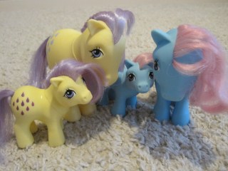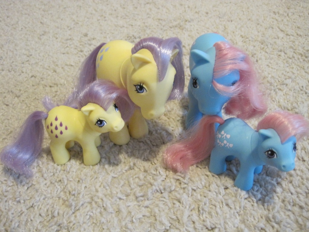 Alemmassa kuvassa yritän kuvata uusia ponejani, mutta utelias amstaffi tekee siitä aika vaikeaa ;) Kaverini oli löytänyt ponit lastentarvikkeiden jakelupisteestä ja ystävällisesti ottanut ne mulle. Molemmat ovat ”oikeita”, eli noita 80-luvun G1-poneja, joita keräilen, ja kumpaakaan mulla ei ollut ennestään. Kiitos vielä Johanna kun muistit mua :)