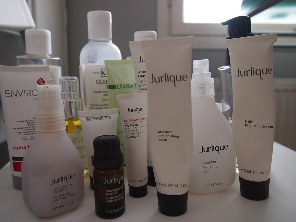 Niin kuin mainitsin, ylläpidän melko tarkkaa rutiinia ihoni kanssa. Kuten viikon Ranskan matkalla tuli todistettua, ihoni kärsii jo siitä, jos viikoksi skippaan kaikki ihoa enemmän hoitavat/kosteuttavat ja kuorivat tuotteet. Toisaalta olen ollut kuluneen viikon ymmälläni siitä, että ihoni on TAAS, kaikkia rutiineja noudattaenkin mennyt (loman jälkeen parannuttuaan) huonompaan kuntoon. Täytyy varmaan alkaa pitää ihopäiväkirjaa niin näkee, liittyykö tämä jotenkin hormoneihin. Arvaan, että liittyy :/
