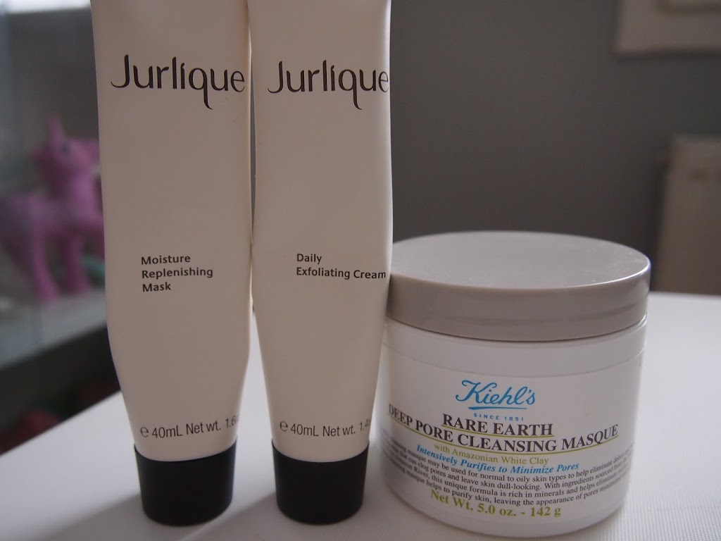 Sunnuntaisin iho kuoritaan ja sille laitetaan naamio. Tällä hetkellä käytössäni on Jurliquen Daily Exfoliating Cream ja Moisture Replenishing Mask. Kuorinta on koostumukseltaan aika samanlaista (ja hajuista) rusehtavan epämääräistä kuin Dr. Hauschkan puhdistusvoide, mutta täytyy sanoa, että pidän Dr. H:n tuotteesta enemmän. Jurliquen tuotteessa voidetta ei saa mitenkään tasaiseksi massaksi, ja monesti sitä on liukunut enemmän sormien väleistä viemäriin kuin päätynyt kasvoille. Mulla oli aiemmin käytössä Atelierin raekuorinta Soft Touch Scrub, josta pidin kyllä enemmän kuin tästä. Samoin itse asiassa mulla aiemmin ollut Atelierin Youth + Face Mask -naamio vie käyttömukavuudeltaan ja tehokkuudeltaan voiton Jurliquesta. Kielh`sin Rare Earth Deep Pore Cleansing Maskin ostin ihohuokosia supistamaan, mutta en osaa sanoa tuotteen toimivuudesta mitään. Kyseessä on savinaamio, jota olen käyttänyt vain T-alueelle.