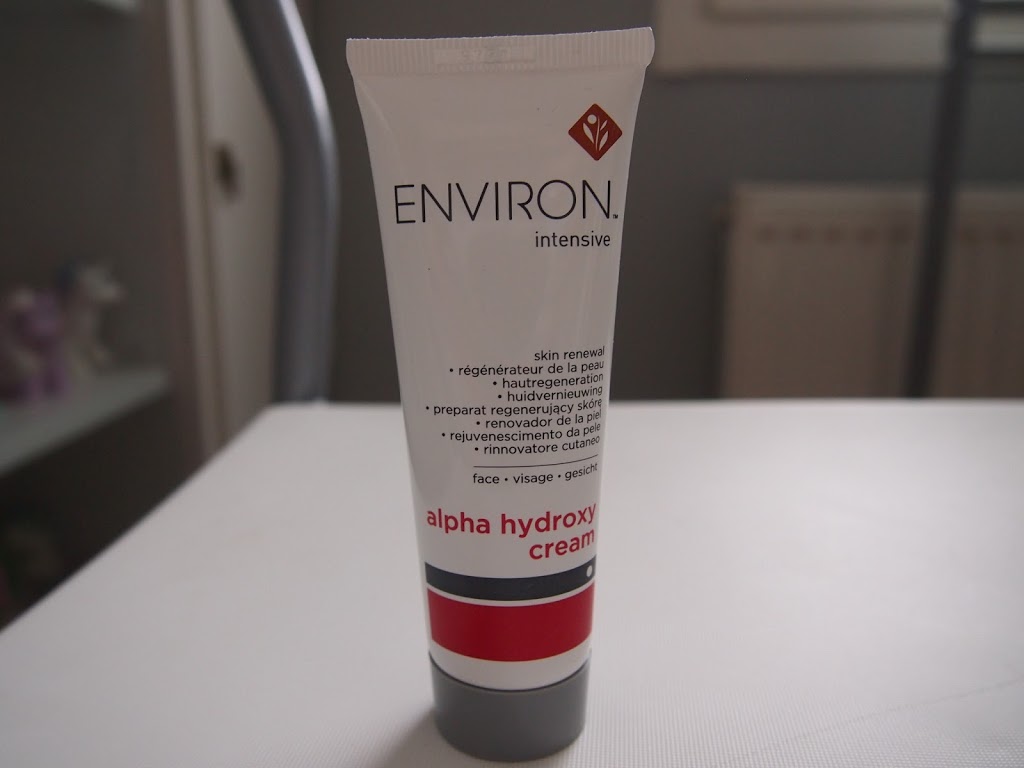 Tiistai- ja lauantaiöiksi levitän ennen kosteusvoidetta Environin Alpha Hydroxy Creamin. Tämä eteläafrikkalaisen, varsinkin anti-ageing-tuotteissa kunnostautuneen sarjan voide kuorii ja uudistaa ihoa AHA-hapon voimin. Hassua, että rasvoittuvalle tai söheröiselle iholle voi joskus käyttää samoja täsmätuotteita kuin pahasti palaneelle iholle. Tämä puteli oli Cindy-kosmetologin vinkki, kun valitin hänelle isoja ihohuokosiani ;)