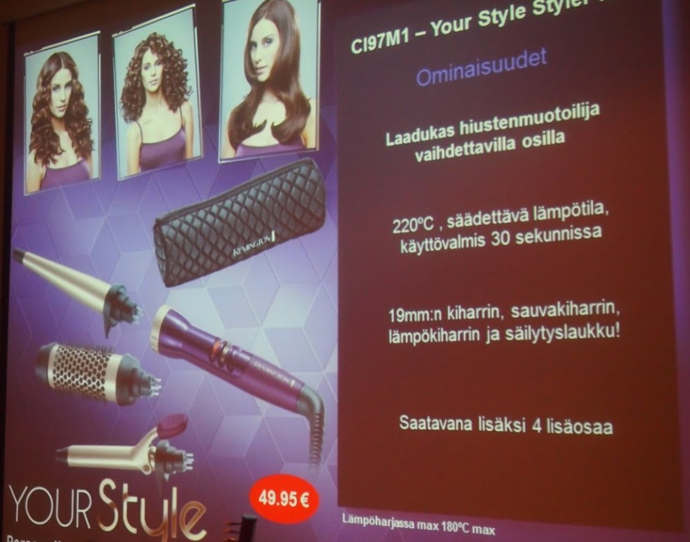 Tilaisuuden keskiössä oli uusi Your Style -monitoimimuotoilija, jossa on samassa paketissa kiharrin, kiharrussauva ja lämpöharja. Hintakin on laitettu mielestäni oikein sopivaksi tällaiselle laitteelle. Laite lämpenee tosi nopeasti (30 sekuntia) ja kiharruspäiden kanssa se lämpenee jopa 220 asteeseen. Lämpöharjan kanssa lämpötilamaksimi on 180 astetta.