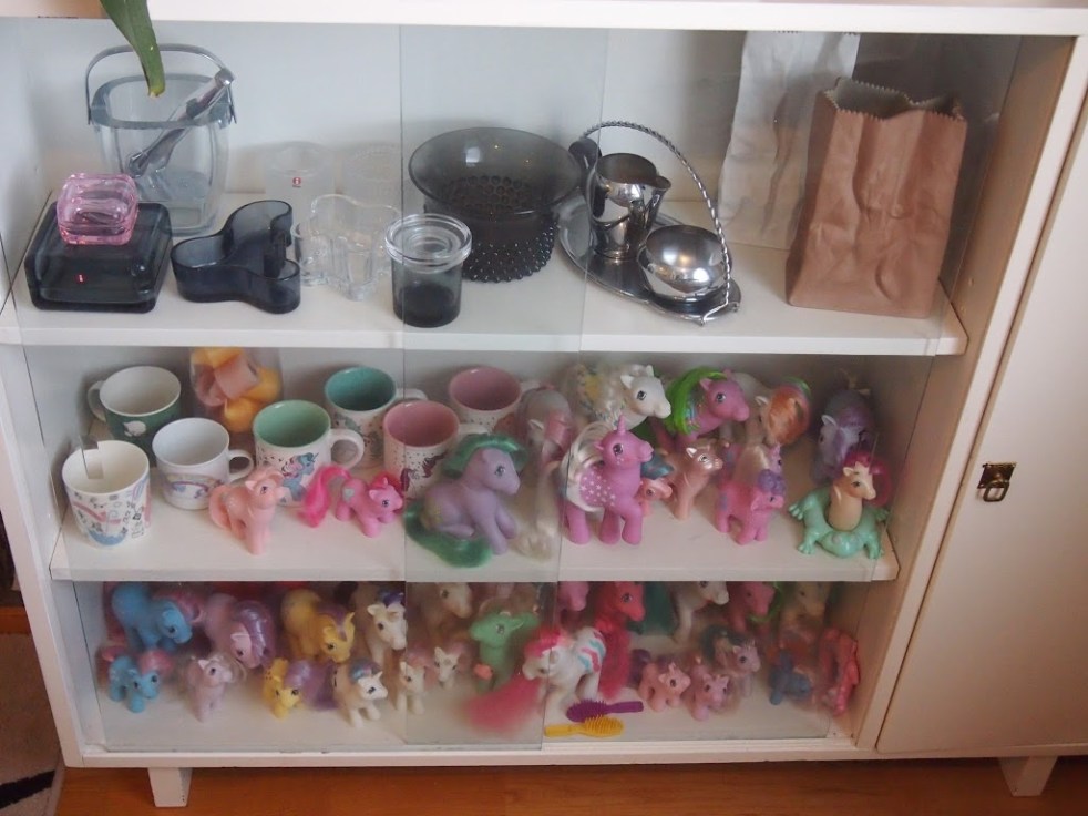 Innostuin nostalgisoimaan lapsuuteni leluja ja kirjoja reilu vuosi sitten, ja päätin ostaa pari ponia, kun olin niin pahoillani, että lapsuuteni ponit oli hävitetty jossain perheemme muutossa. Ei se ihan pariin poniin jäänyt sitten kuitenkaan. Olen kuitenkin onneksi tosi nirso ja tarkka keräilijä. Ostan vain todella hyväkuntoisia poneja, ja vain niitä, jotka todella miellyttävät silmää. Loppujen lopuksi löydän aika harvoin ponin, jonka haluan ostaa. Keräilen nimittäin vain ja ainoastaan ”ensimmäisen sukupolven poneja” eli G1-poneja. Näitä ovat vuosina 1982-1993 julkaistut ponit, eli näitä ei voi marssia kaupasta ostamaan. Ne ponit, joita nyt myydään Prismoissa, ovat mun päässäni jotain ihan muuta, kuin My Little Ponyja. Ja ovathan ne aivan eri näköisiäkin isoine megapäineen ja ufon silmineen. Tuli varmaan selväksi, että me no likey. Oman suolansa keräilyyn tuo nimenomaan se, että tässä hommassa rahalla toki saa tiettyyn pisteeseen asti, mutta kun saatavuus on todella rajoitettu, on myös hyvä onni tarpeen ja silmät kannattaa pitää auki aina kirpputoreilla liikkuessaan.