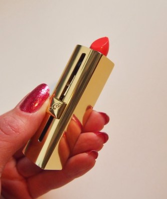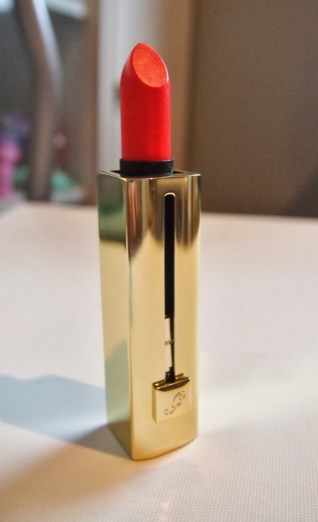 Guerlain on todellinen luksusmerkki, mistä varmaan johtuu, etten ole ennen omistanut mitään kyseiseltä merkiltä. Mutta hyvänen aika katsokaa nyt ihan oikeasti, miten täydellisen kaunis tämä automaattihylsy on! Mä olen oikeasti huokaillut ääneen hipelöidessäni tätä upeaa kultaista pakkausta. Sävykin on tietysti upea, kaunis koralli Corail Ora. Mutta tiedättekö, en ole raaskinut vielä edes kokeilla tätä! Tämä on jotain, mitä ei ole koskaan ennen tapahtunut :) Totta kai kosmetiikka ostetaan käyttöä varten, mutta taidan vähän aikaa vain ihailla punan täydellistä pintaa ja hylsyn naarmutonta kultaista kiiltoa :).
